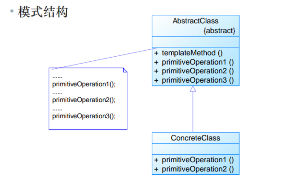 模板方法模式是一种类的行为型模式,在它的结构图中只有类之间的继承关系,没有对象关联关系。