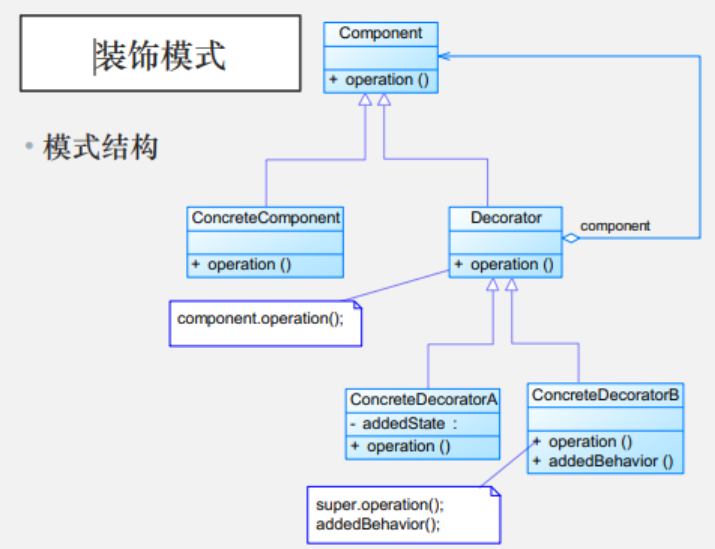Component: 抽象构件类ConcreteComponent: 具体构件类Decorator: 抽象装饰类ConcreteDecorator: 具体装饰类